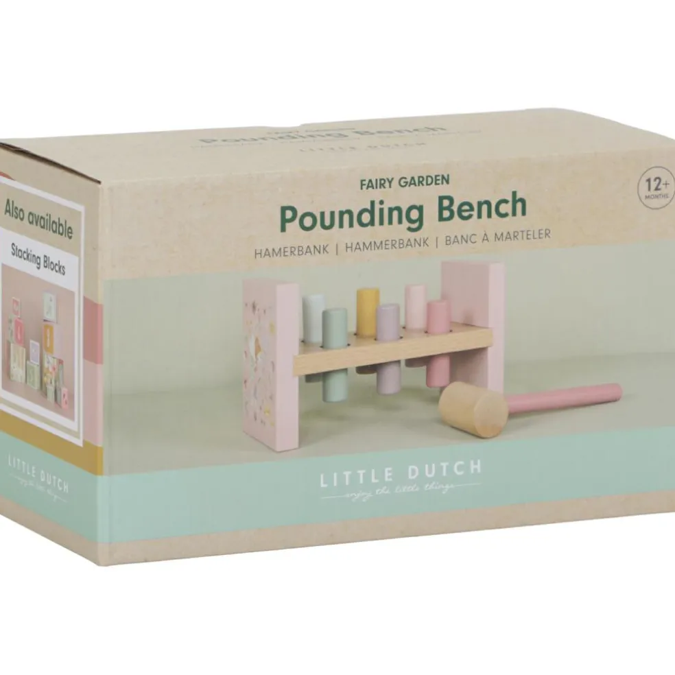 – Tapez avec le marteau pour enfoncer les 6 bâtonnets de couleur dans l’établi en bois.