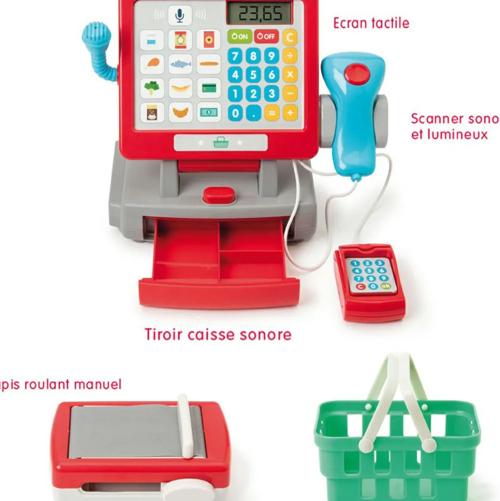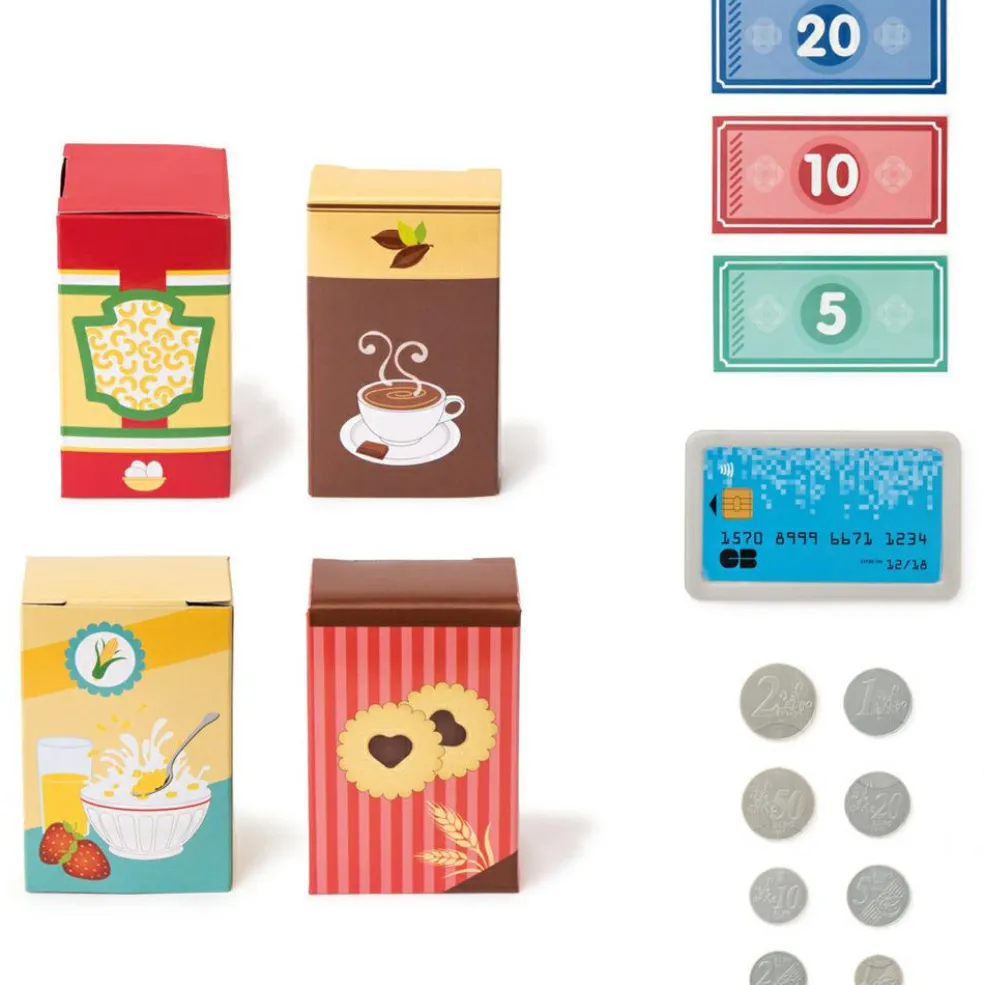 – Contient : 1 tapis roulant, 1 lecteur de carte de paiement, 1 carte de paiement, 12 billets, 12 pièces, 1 panier, 4 boîtes.