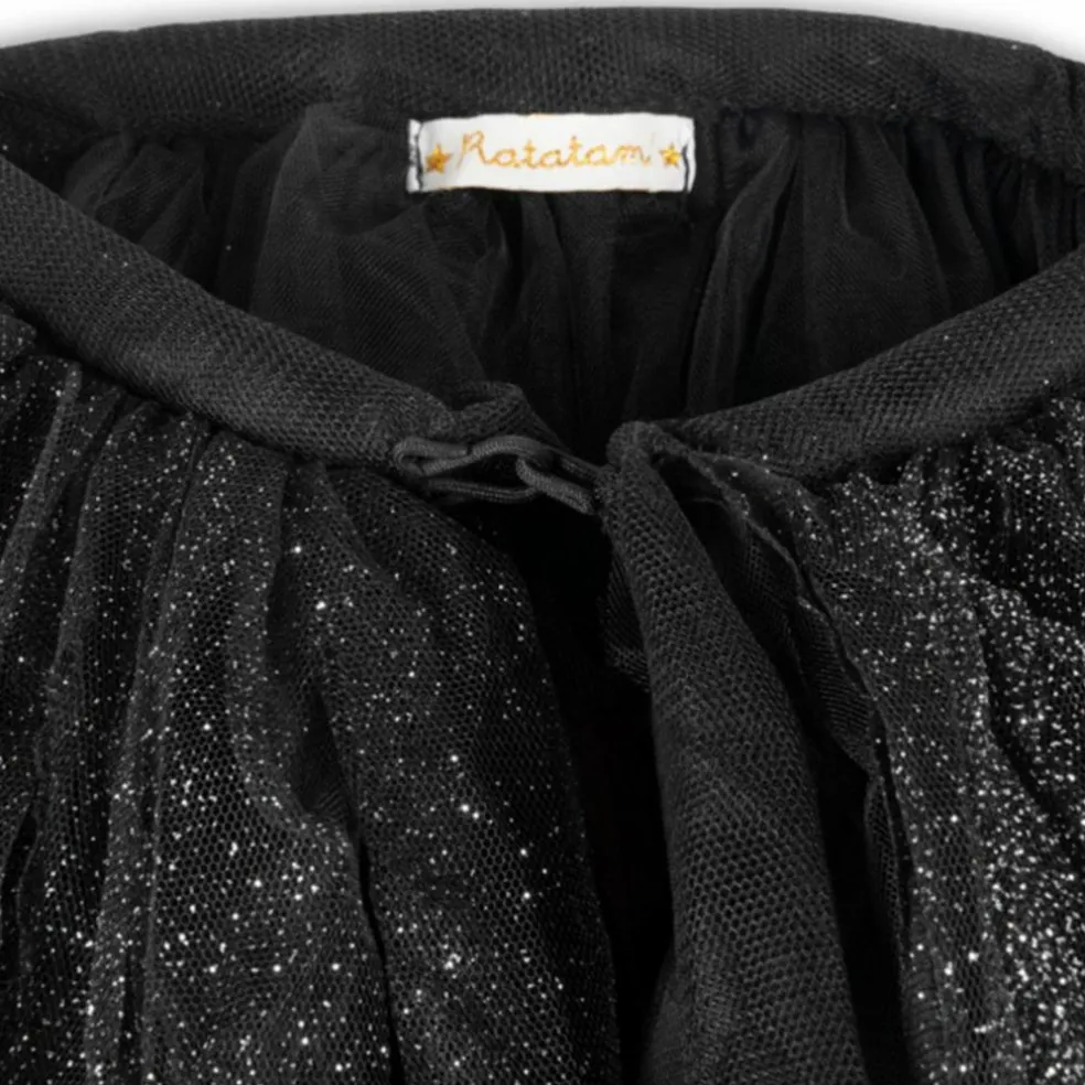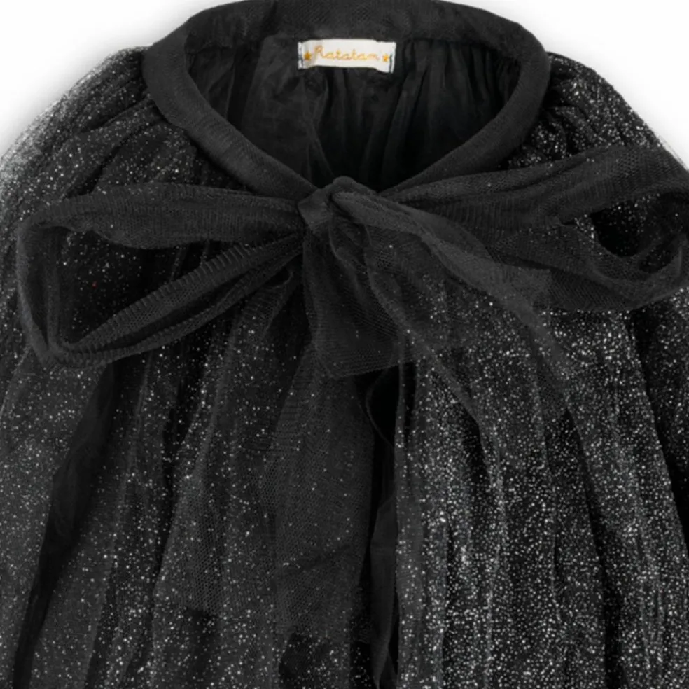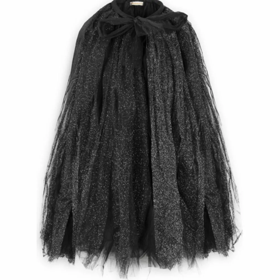 – Modèle : cape-jupe en tulle noir avec paillettes argentées.