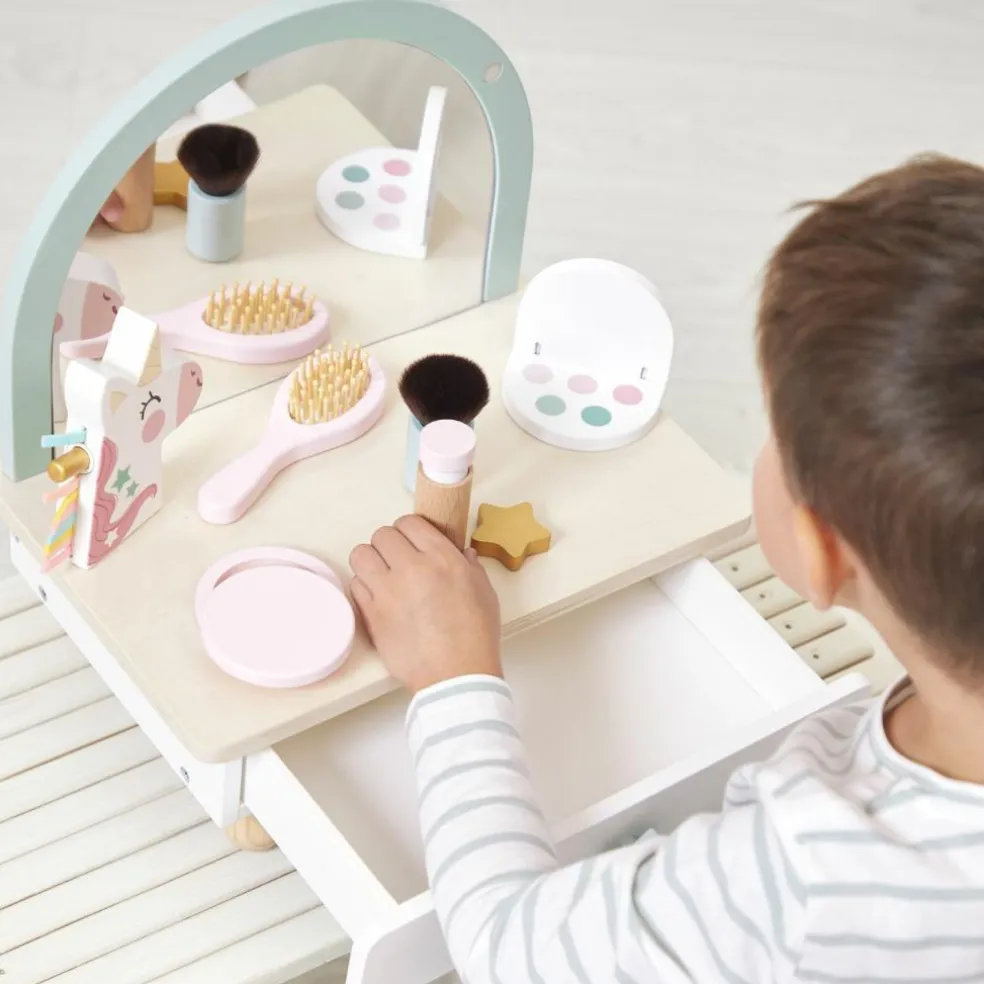 Avec ses couleurs douces, ses finitions soignées et sa touche malicieuse, cette coiffeuse compacte transforme chaque moment en une aventure enchantée. Posée sur une table ou directement au sol, elle invite votre enfant à imiter les grands, à chouchouter ses poupées ou à se créer un univers de beauté licornesque.