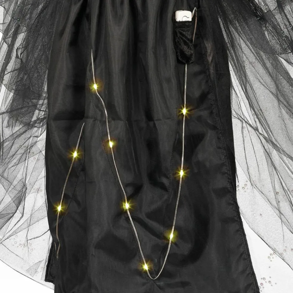 Avec son tissu noir orné de sequins scintillants et ses manches amples en tulle transparent, cette robe est un mélange parfait d’élégance et de féérie. Le petit plus qui la rend unique ? Des lumières LED intégrées qui illuminent la jupe pour créer un effet spectaculaire, comme un ciel étoilé en mouvement.