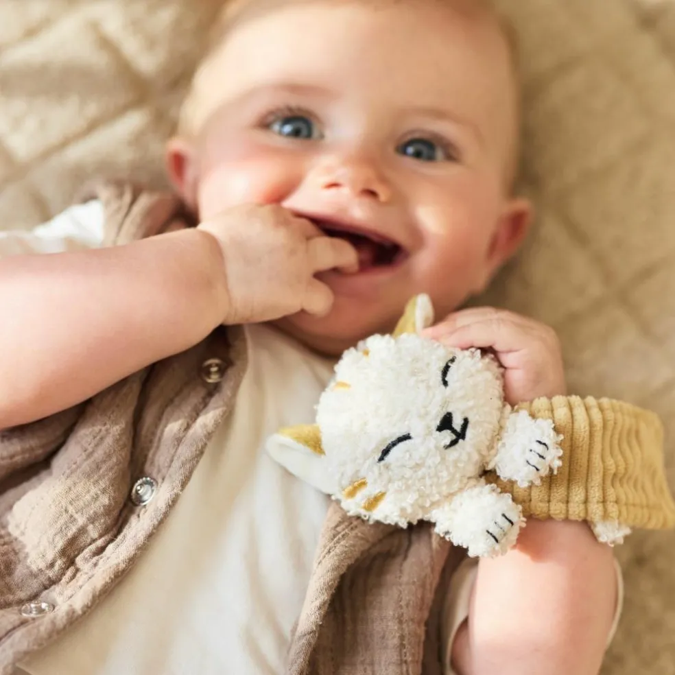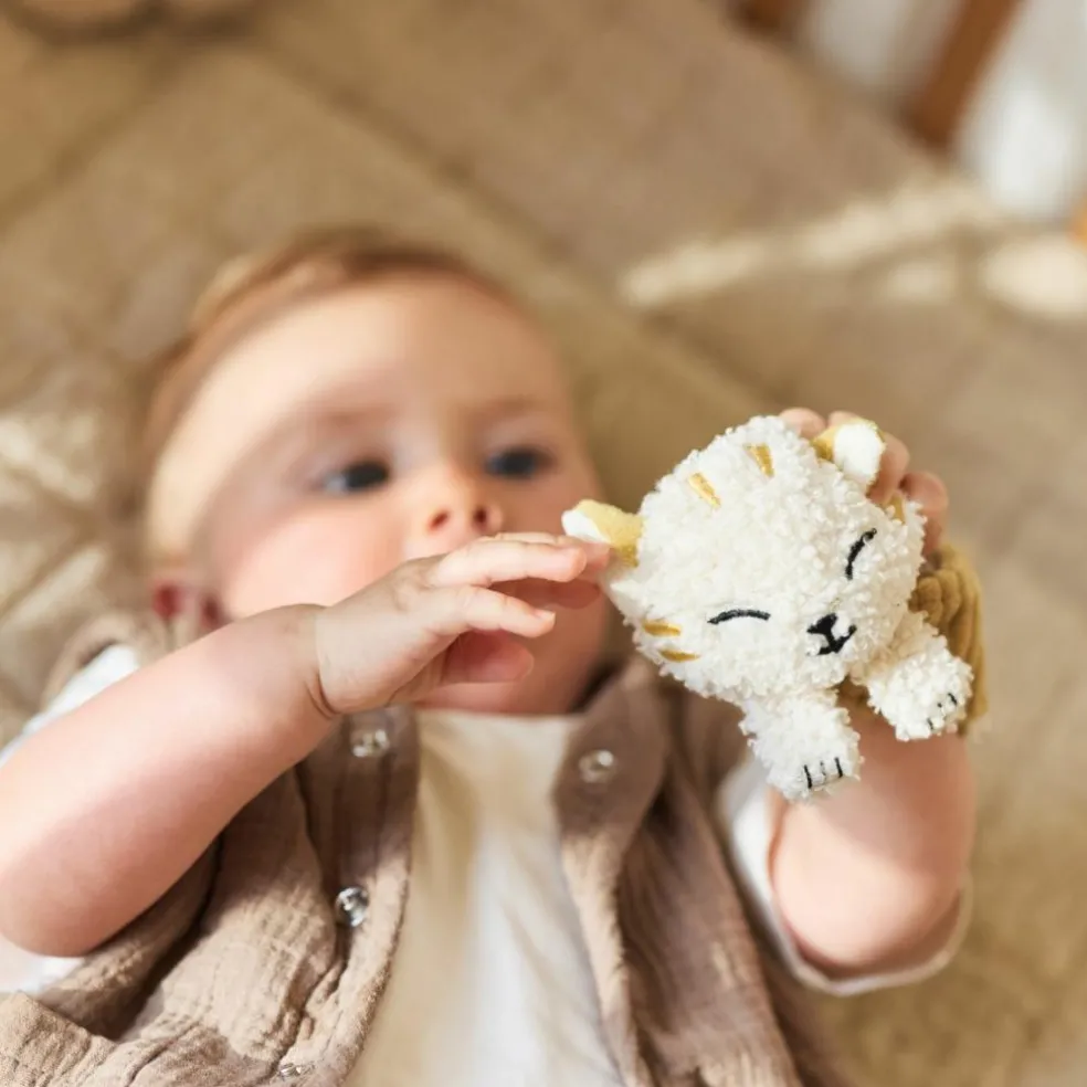 Charlie séduit avec son visage souriant brodé, ses petites pattes en bouclette blanche et son bracelet en velours côtelé beige. Doux, souple et léger, ce hochet ne gêne pas bébé dans ses mouvements et reste bien en place grâce à une fermeture adaptée. À chaque secousse, le grelot intégré stimule l’ouïe et attire l’attention de bébé, favorisant la coordination et la motricité.