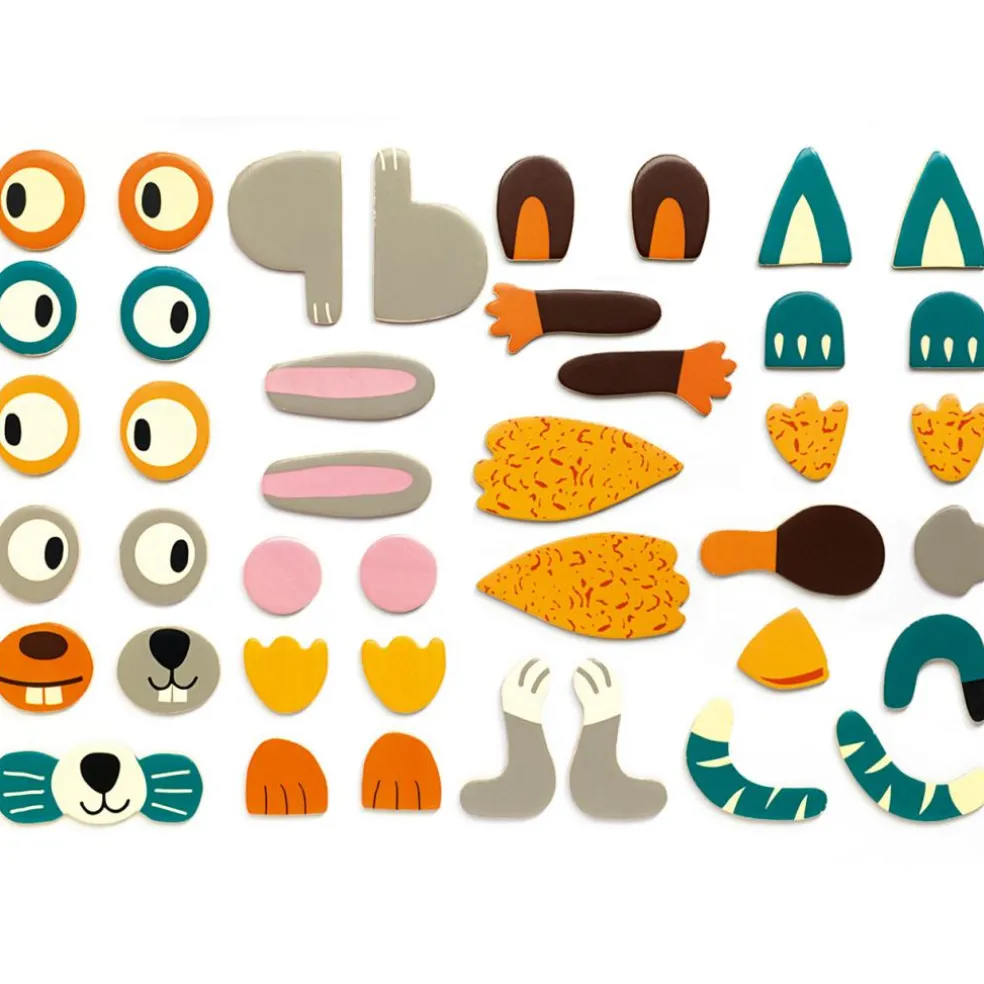 – 41 éléments en bois magnétiques pour recréer des animaux sur la boîte.