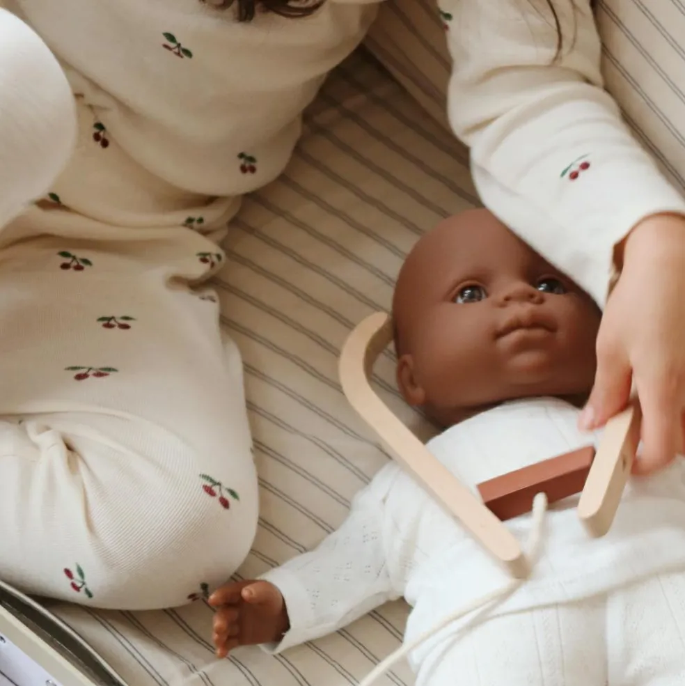 – Poupée fabriquée en vinyle avec un tissu en coton bio et un rembourrage en polyester recyclé.