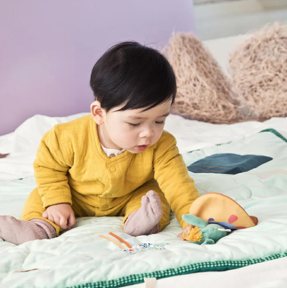 – 2 en 1 : tapis de jeu et sac de couchage.