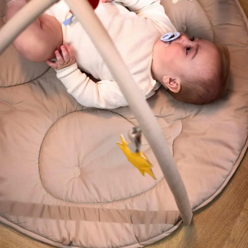 Avec son design apaisant et ses couleurs naturelles, le tapis d’activité Fjord de FILIBABBA est une invitation à explorer, bouger et s’émerveiller. Ses arches amovibles accueillent trois jouets sensoriels spécialement pensés pour stimuler l’imagination et l’éveil de votre enfant : une petite baleine toute douce avec papier bruissant, une montgolfière colorée avec clochette et un miroir en forme d’étoile pour jouer à cache-cache avec son reflet.