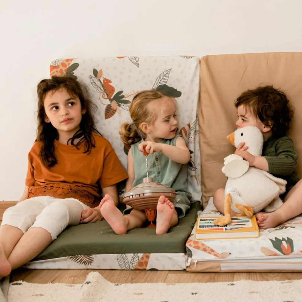 – 2. Plié en deux, il se transforme en couchage d’appoint ou en coin lecture (60 cm x 60 cm x 10 cm).