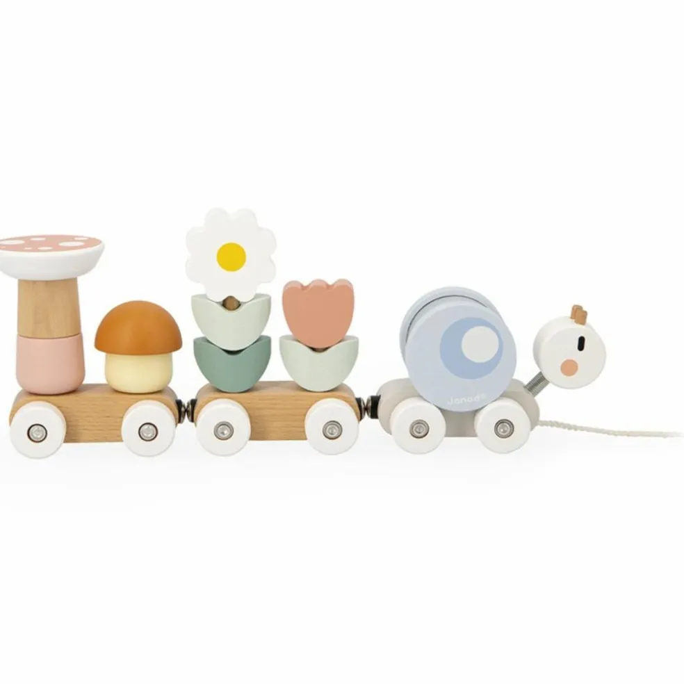 Les formes variées (champignons, fleurs…) invitent bébé à manipuler, réfléchir, créer. Et au fil de ses explorations, il découvre une belle surprise : le premier wagon est un escargot… dont la coquille est un hochet à billes transparent ! Il peut le secouer pour éveiller son ouïe, observer les billes bouger pour stimuler sa vue, et le voir rouler lorsqu’il est posé sur le dos du petit escargot en mouvement.