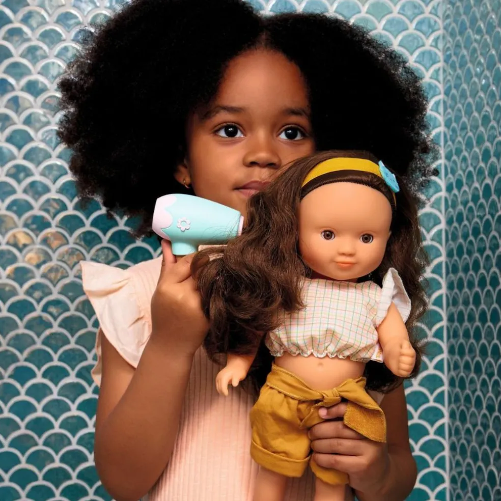 – Après avoir fait semblant de sécher les cheveux de sa poupée, la brosse en bois avec des fibres souples démêle et fait briller la chevelure de la poupée.